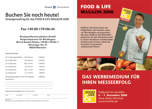 2013 Im 60.-Geschäftsjahr 2013 beendet die Rossipaul Kommunikation ihre Geschäftstätigkeit* ab 1.1.2013 existiert die Rossipaul Kommunikation nur noch „i.L.“ d.h. „in Liquidiation“. Zum Jahresende 2012 wurden die verschiedenen Verlagsobjekte an die Harenberg Kommunikation Verlags- und Medien GmbH & Co.KG, an Haymarket bzw. an den bitverlag Weinbrenner übergeben – Details siehe Chronik. Unsere Buchmagazine -> jetzt unter www.buchaktuell.de Unsere Gartenmagazine -> jetzt unter www.haymarket.de Das Fachmagazin P&G -> jetzt unter www.bitverlag.de SOMMER 2011 P&G und beststyle bei facebook Die Fachzeitschrift der Haushaltswaren-Branche P&G und das Kundenmagazin beststyle sind ab sofort bei Facebook vertreten. Fans finden auf www.facebook.com/PundG und www.facebook.com/beststyleMagazin Produkt-Highlights, Messehinweise, Interviews, Personalien und vieles mehr. Ein zusätzlicher Service für all diejenigen, die in der Branche immer Bescheid wissen möchten. Streuprospekt Bücher-Weihnacht auf Erfolgskurs Bereits heute können wir eine vorbestellte Auflage von rund 2,5 Mio verzeichnen. Über 150 Buchhandlungen haben fest gebucht, darunter solche Flaggschiffe wie Peterknecht in Erfurt, Nordseepassage in Wilhelmshaven, Ravensbuch in Ravensburg u.v.a. Sie setzen auf den Verkaufserfolg durch Bücher-Weihnacht und nutzen die Möglichkeiten zur Sonderausstattung, um dem Prospekt ihr unverwechselbares Gesicht zu geben und eigene Sortimentsschwerpunkte zu bewerben. FRÜHJAHR 2011 Kooperation mit NBB egesa Mit der NBB egesa gewinnt die Rossipaul Kommunikation neue Händlergruppen für den regelmäßigen Einsatz des Kundenmagazins ParadiesGARTEN. Ab 2011 setzen die egesa- und gartenspezi-Betriebe 4 x jährlich das Heft mit individueller Titelseite zur Bewerbung ihres Pflanzensortiments und zur Information für ihre Kunden ein. Daneben wird der ParadiesGARTEN regelmäßig von der grün erleben-Gruppe der Sagaflor sowie zahlreichen weiteren Gärtnereien und Gartencentern eingesetzt. NEU: Balkon & Terrasse und Gartenakzente aus der Reihe Mein Paradies Extra Mitte April erscheinen zwei neue Sonderhefte aus der Reihe Mein Paradies Extra: Balkon & Terrasse vermittelt die schönsten Anregungen zu Beet- & Balkonpflanzen. Viele Bildstrecken lassen den Leser in Farben und Formen schwelgen und machen Lust auf das eigene Urlaubsparadies zu Hause. Gartenakzente zeigt, wie man mit einfachen gestalterischen Tricks, geeigneten Pflanzen und ungewöhnlichen Ideen das Beste aus jedem Garten herausholt. Für die Händler der Sagaflor-Gruppen grün erleben und da blüh ich auf wurden jeweils Sonderausgaben erstellt. Darüber hinaus werden die Themenhefte erfolgreich im Zeitschriftenhandel vertrieben. Herzlichen Glückwunsch, Mein Paradies! Mein Paradies feiert in 2011 zehnjähriges Jubiläum und wartet mit vielen Überraschungen auf: Wir verlosen eine Gartenreise nach England und starten mit einer neuen Serie über gärtnerische Traditionsbetriebe; die Optik der Titelseite wurde aufgefrischt; neben dem bewährten Mix aus opulenten Fotos und fachlich versierten Texten bieten praxisorientierte Themenspecials viel Zusatznutzen für jede Ausgabe. Herbst 2010 Bewährtes wird noch besser: Relaunch TaschenbuchMagazin Unser neues TaschenbuchMagazin ist schöner und noch lesenswerter geworden. Ab der Herbstausgabe findet sich in jeder Ausgabe ein zugkräftiges Aktionsthema auf vielen Extraseiten, das aufmerksamkeitsstark auf der Heftklappe visualisiert wird. Den Anfang macht Vorsicht Hochspannung! mit packenden Krimis und Thrillern aus aller Welt. Als zweite wichtige Neuerung sind zu ausgewählten Titeln QR-Codes abgedruckt, mit denen jeder PC-Anwender oder Besitzer eines Smartphones eine ca. 20-seitige Leseprobe im Internet aktivieren kann. Zu den Großabnehmern des TaschenbuchMagazins gehören u.a. die Buchhandlungen Decius, Heymann, Peterknecht, Pustet und Rombach, die individuell gestaltete Umhefter einsetzen. Zudem sind alle Bezieherbuchhandlungen mit attraktiven Deckenhängern und Plakaten ausgestattet, um mit Aktionstischen die Spitzentitel im Heft verkaufsstark zu präsentieren Frühjahr/Sommer 2010 Kooperation mit Pflanzen-Kölle Das traditionsreiche Familienunternehmen Pflanzen-Kölle mit deutschlandweit 12 Standorten setzt auf die bewährte Qualität der Mein Paradies Extra-Hefte. Mit individuellen Pflanzen-Kölle-Sonderausgaben der Themenhefte Kräuter und Rosen wurden im ersten Halbjahr 2010 gleich zwei Projekte realisiert. Die Inhalte der Standard-Ausgaben wurden um Kölle-spezifische Produktwelten und Bildstrecken ergänzt. Die erfolgreiche Zusammenarbeit wird in 2011 fortgesetzt werden. November 2009 Die neuen Mediakarten 2010 der Rossipaul Kommunikation stehen im Mediadaten-Bereich für Sie zum Download per .pdf bereit! Februar 2009 Für Thalia in Hagen hat die Rossipaul Kommunikation specialinteressierte Magazine entwickelt, die als bundesweite Beilagen in Zielgruppenzeitschriften wie Brigitte, Freundin und Superillu gestreut werden. Zusatzauflagen am P.O.S. sicherten den Erfolg der Startaktion zum Thema Gesundheit/Wellness im Zeitraum Januar/Februar 2009. Im Mai 2009 erscheint das Thalia Magazin Special für die allerwichtigste Zielgruppe des Buchhandels, Frauen. November 2008 Die neuen Mediakarten 2009 der Rossipaul Kommunikation stehen im Mediadaten-Bereich für Sie zum Download per .pdf bereit! Juli 2008 Für die GHM Gesellschaft für Handwerksmessen, München, wird die Rossipaul Kommunikation zur Food & Life (4.-7. Dezember 2008 Neue Messe München) ein eigenständiges Besuchermagazin in einem Umfang von 32 Seiten herausgeben. Mit Klick auf die Abbildung können die Mediaunterlagen eingesehen und heruntergeladen werden. ![]() Juli 2007 Folder P&G / Nullnummer P&G / Nullnummer beststyle ![]() Mit Klick auf diese Abbildungen öffnet sich der farbige Folder mit der Optik und den wesentlichsten Inhaltsbestandteilen der neuen P&G, die ab Januar 2008 in der Rossipaul Kommunikation GmbH, München, erschei